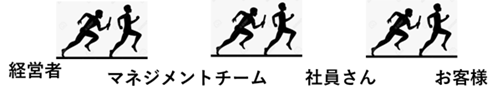 バトンリレーとは、以下の図のように経営者からお客様までの経営の意図のバトンリレーを言います。会社とお客様との接点は商品サービスです。会社の理念もビジョンも結局は短期的にも中長期的にもお客様への商品サービスに落とし込まれなければ意味を成さないわけです。経営者を第一走者としたバトンリレーは、お客様まで伝わって(お客様への特有の使命を果たして)初めて成果となります。