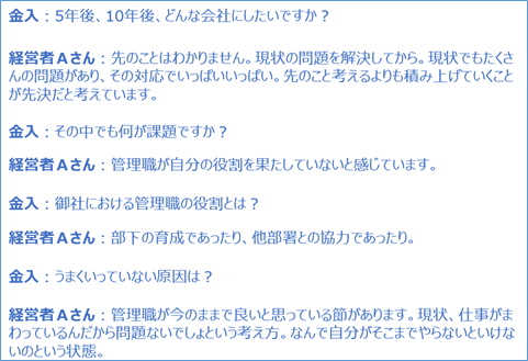 ここでひとつ、事例をご紹介いたします。以前、ある後継社長とお話をさせて頂いた際に、次のような会話をしました。