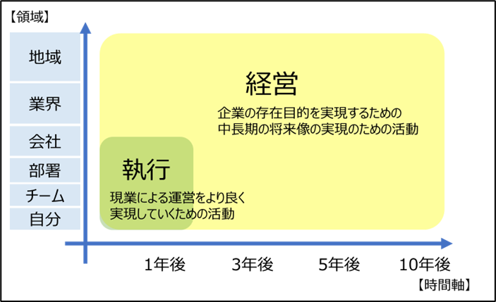 「経営」は、企業の存在目的を実現するための中長期的な将来像の実現のための活動。「執行」は、現業による運営をより良く実現していくための活動。
