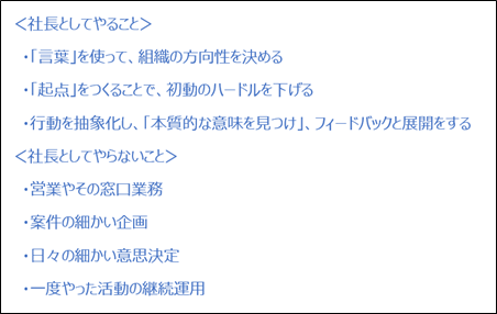 明確に決めることによって、10年後のビジョンに向けた施策を優先度高く進められる状態がつくられます。決めていないとついつい現場に首を突っ込みたくなり、執行中心に逆戻りしてしまいます。そうではなく、この経営者の言葉にもある通り、新しい事業の「起点」となる役割を社長が担うことが重要になります。新しい事業や取り組みは、とにかく難易度が高いため、苦戦します。社員に任せていてはなかなか前に進みません。社長が率先垂範で取り組み、社員を巻き込みながら進めていくことが必要になります。