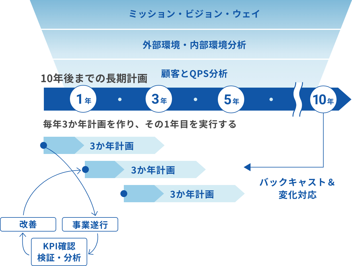 そのうえで、そこへ到達するための3年先の地点目標としての中期的な計画を定めます。
