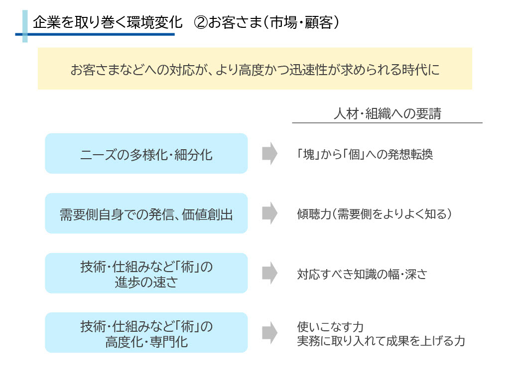 次に、自律型人材が今後ますます必要となる背景について、現場の人材、お客さま、の2つの視点から、改めて考えてみたいと思います。