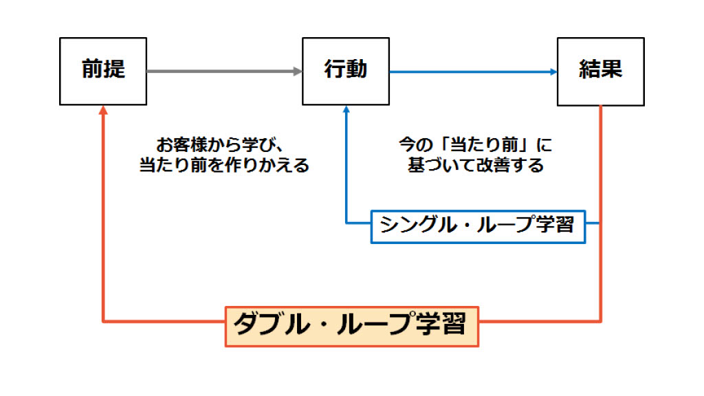そこで、良い意味で「前提」を疑います。お客さまのニーズを捉えなおし、「前提」そのものを再構築して、「行動」に移すのです。このような学習を「ダブル・ループ学習」といいます。この「ダブル・ループ」学習が行われているかどうかが、本当にお客さまから学び、変化していくために必要なポイントとなります。